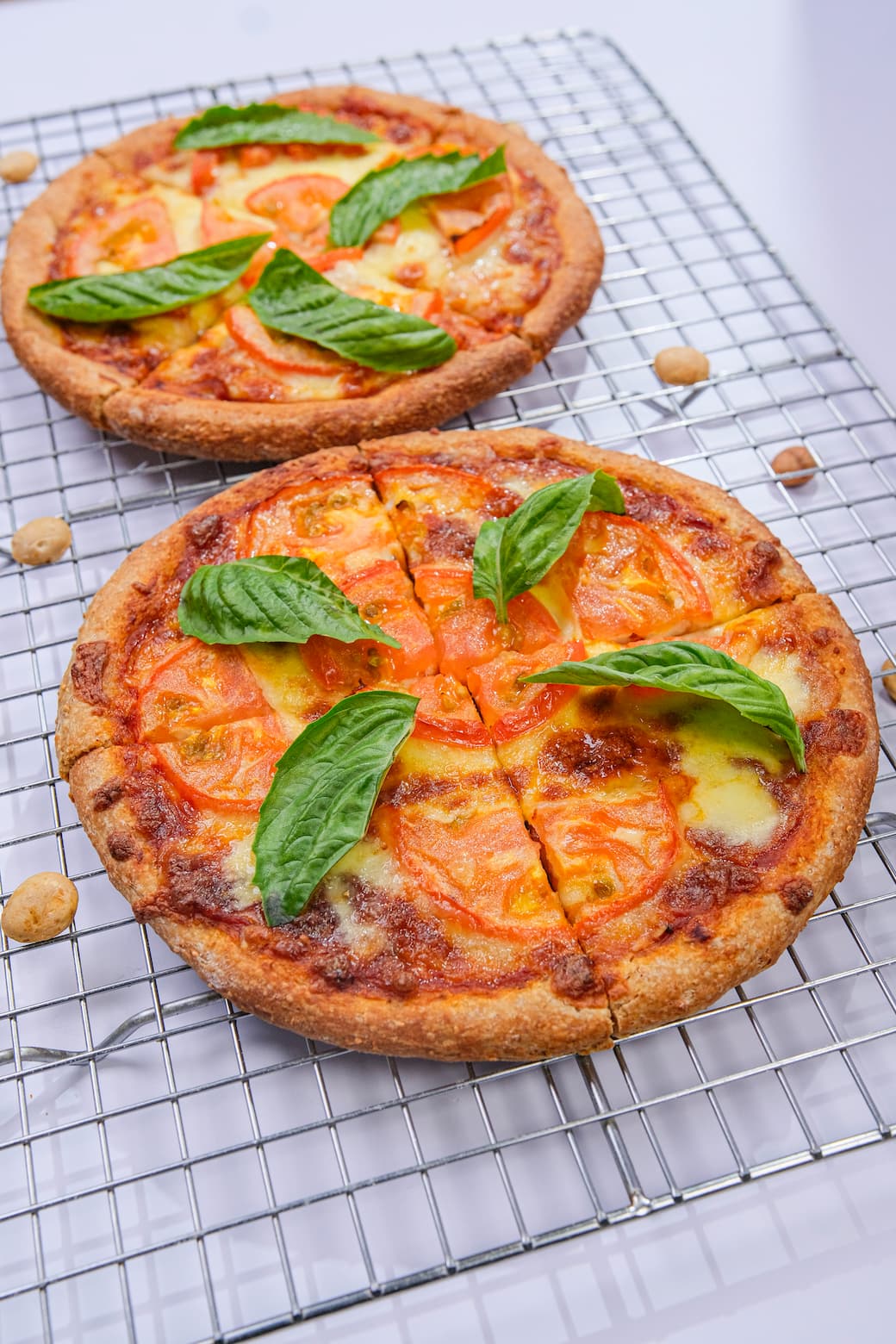 - Add sauce, cheese, and tomatoes. Bake 10–12 min at 220 °C.